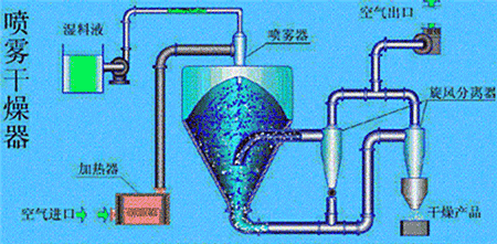 本機組工作過程為料液通過隔膜泵高壓輸入,噴出霧狀液滴,然后同熱空氣并流下降,大部分粉粒由塔底排料口收集,廢氣及其微小粉末經旋風分離器分離,廢氣由抽風機排出,粉末由設在旋風分離器下端的授粉筒收集,風機出口還可裝備二級除塵裝置,回收率在96-98%以上。