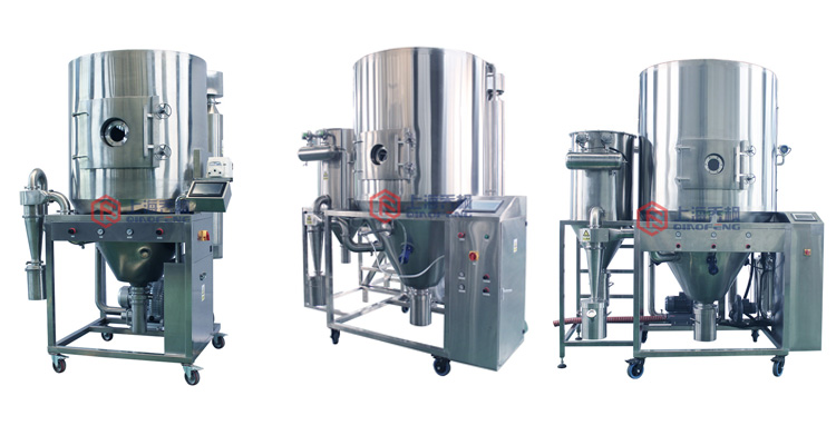該機組核心裝置為造粒霧化器。藉此將液體霧化成微米級霧滴后被熱風(fēng)迅速干燥,干燥后的顆粒經(jīng)過底部收料瓶回收,粉末經(jīng)過旋風(fēng)分離器回收。設(shè)計進風(fēng)溫度最高為250℃,出風(fēng)溫度為145℃左右。