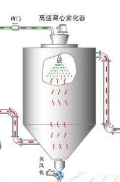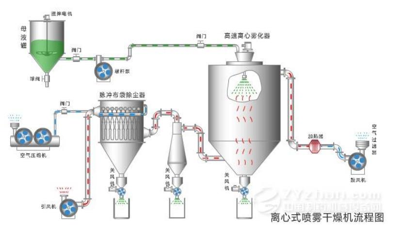 經(jīng)過(guò)過(guò)濾和加熱后,空氣進(jìn)入干燥機(jī)頂部的空氣分配器,熱空氣以螺旋狀均勻進(jìn)入干燥室。 物料液體通過(guò)塔身頂部的高速離心霧化器或高壓霧化器噴入非常細(xì)的霧狀液珠中,并且可以在很短的接觸時(shí)間內(nèi)干燥成成品 與空氣平行。 成品從干燥塔和旋風(fēng)分離器的底部連續(xù)輸出,細(xì)粉塵通過(guò)脈沖袋式集塵器收集,廢氣通過(guò)風(fēng)扇排出。