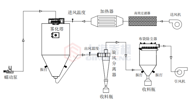 特點4、噴霧干燥機(jī)簡化了工藝流程。蒸發(fā)、結(jié)晶、過濾、粉碎等操作過程可通過噴霧干燥一步完成。由于離心霧化器產(chǎn)生的霧群基本在同一水平面上,霧滴沿徑向和切割的合成方向移動,幾乎沒有軸向的初始速度,因此干燥器的直徑相對較大。所以干燥的物料粒徑均勻性好,流動性和溶解性好。